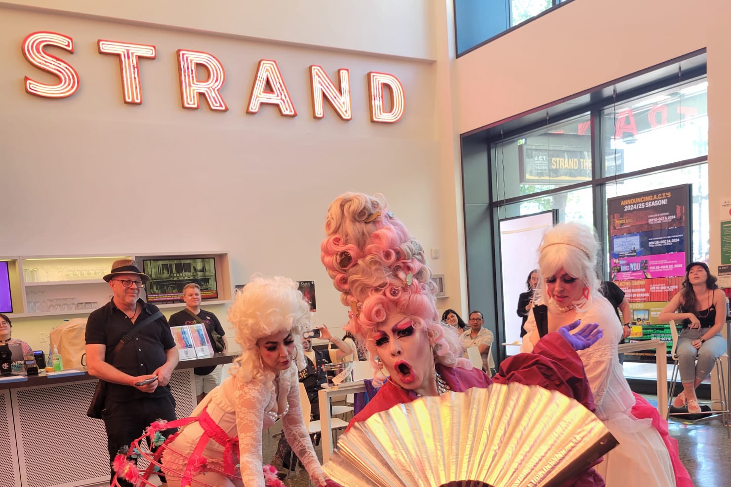 - Civic engagement activates the Strand Theater's unique geographic positionality in Civic Center, across from City Hall, on Market Street where the parades and protests pass by. When possible, we open the doors of the Strand for the public to use our restrooms, drink water, and take a load off. We like to say "this is your theater, San Francisco!" and it feels especially true when parade-goers can step inside, rest and regroup, and learn more about A.C.T. in conversation with friendly staff members. For San Francisco's world-famous Pride parade, we take it to a new level, opening the bar, hosting a photobooth, filling the lobby with music and drag performances, and celebrating the queer diversity of the city we love.